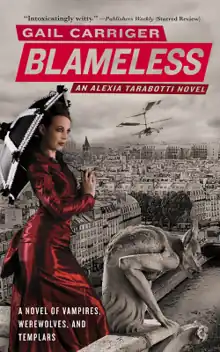 Blending steampunk with urban fantasy, Blameless is set in an alternate history version of Victorian era Britain where vampires and werewolves are welcomed as members of society, often in the upper class. Alexia Tarabotti, the Lady Maccon, leaves her werewolf husband Lord Maccon and moves back in with her family, only to find herself at the center of a scandal when it is discovered that she is pregnant: werewolves are not considered capable of fathering children, and therefore she must be an adulterer. She is dismissed from the Shadow Council by Queen Victoria and her social support structures disintegrate. Meanwhile, the vampire community of London has turned against her. While her estranged husband increasingly turns to drinking to ease his pain, Alexia leaves England for Italy, the birthplace of her late father, to seek out the Templars for answers. Because she is "soulless", and so unaffected by the abilities of supernatural beings, her journey to the truth is more complicated than even she can imagine.[2]