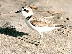The wetlands is one of the most important areas for birds in Colorado since it provides habitat for migrating waterbirds or shorebirds. It hosts thirteen threatened, endangered and sensitive species.[4] The bald eagle and the peregrine falcon use the wetlands. The snowy plover and the white-faced ibis have been documented as nesting. Other Species of Management Priority that have been documented are American bittern, avocet, common yellowthroat, eared grebe, Forster's tern, greater sandhill crane, hen harrier, Savannah sparrow, snowy egret, sora rail, western grebe and yellow-headed blackbird.[3] Shorebirds such as gulls, sandpipers and pelicans are at home in the salty environment, as well as 158 other species.[1] There is a breeding population of snowy plover.[9] The wetlands is a duck breeding concentration area, with mallards by far the most common, but good numbers of pintail and green-winged teal also visiting.[10]