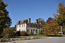 The Blazo–Leavitt house has five large brick chimneys[2] and ten fireplaces. The home also boasts elaborately carved and pillared entrances with leaded glass fans and sidelights, panelled doors, and small-paned windows. A complete description of the interior of the house is described in a long narrative poem entitled "Flora Visits Parsonsfield" by Mary Freeman, a resident of the house for thirty years and great, great granddaughter of Robert and Mary Blazo. The main ell of the home was built in 1812, the main part of house being constructed five years later in 1817. William Blazo was son of Amos Blazo, who in turn was son of William Blazo of Bordeaux, France, who emigrated to America sometimes before 1727, settling first in Greenland, New Hampshire, and later in Epsom. Amos Blazo is recorded in the History of Parsonsfield as having been North Parsonsfield's first settler, clearing the fields at "Blazo's Corner" in March 1778. Amos Blazo had five sons, four of whom settled on nearby farms. It was Amos's son William who built the Blazo House, later selling it to his nephew, and Amos's grandson, Robert Tibbetts Blazo.