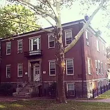 Building 9 was constructed in 1839 in the Greek Revival style and was initially used as the Post Hospital. The roof of the building was originally flat, but was replaced with a hip roof in 1864 because the flat roof would leak.[3][4][5] Ten years later, two wings for patient wards were built because the original structure was so poorly ventilated.[4] In 1878–1879, Building 9 was converted to offices for the Military Division of the Atlantic and the Department of the East.[3][4][5] The building was used for various Army commands until the 20th century, and by 1947, the structure was converted to four sets of officers' quarters.[4][5]