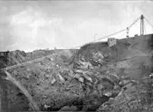 Penrhyn quarry in Bethesda was based around a single large pit over 400 feet deep, worked as a series of terraces. It adopted blondins in 1913. A variety of means were used to transport slate from the terraces to the mills where the rock was processed. The quarry already had an extensive internal narrow gauge railway system in place, and many terraces were connected via inclines. Blondins were used to connect more remote terraces directly to the mills - they were distinguished by the fact that rock was transported on the ropeways in railway wagons slung from cradles. The ropeways ran horizontally or nearly horizontally until the cradle hit a stop, at which point the wagons were automatically lowered to ground level, where they were moved by rail to the point of loading or unloading.[3]