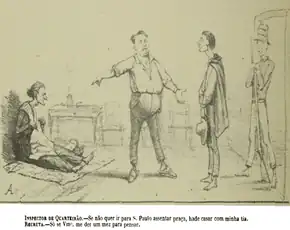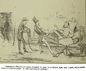 Soldiers entered military service voluntarily or by force.[7] In 19th century Brazil, "recruitment" was synonymous with forced recruitment. Authorities would refer to the "seizure" and "arrest" of recruits. There was no neutral term to refer to all recruits (volunteers or obligated). The term "recruited" was sometimes used specifically for the obligated.[8] In the legislation on the subject, the term "forced recruitment" appears in the decree of 1835, but not in the ministerial instruction of 1822, which established escorts for recruits, but without chains, handcuffs or shackles.[9] Even so, there were reports of recruitment literally "with a snare", with recruits being tied up.[10] The free population saw military service as degrading, and since the 17th century authorities had noted the repugnance with which it was perceived.[11] The violence and arbitrariness of recruitment, added to the harsh discipline and low remuneration in service, gave it the connotation of punishment,[12][13][14] being associated with captivity in the popular imagination.[15] The process was called "human hunting"[16] or "blood tribute".[17]