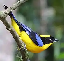 The blue-winged mountain tanager (Anisognathus somptuosus) is a species of bird in the family Thraupidae, the tanagers. It is found in highland forest and woodland in the Andes of Bolivia, Colombia, Ecuador, Peru and Venezuela, as well as a disjunct population in the Venezuelan Coastal Range. It is a common species and its populations appear to be stable.[1] It is generally bright yellow and black with blue to the wings and tail; some populations have a moss-green back.[2] In Bolivia and southernmost Peru, the rump is blue and the voice is very different;[2] this population is sometimes recognized as a separate species, the Bolivian mountain tanager (A. flavinucha).[3]