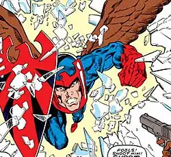James Dore Jr., who was born in Mayflower, Freedonia on his Earth, was an airplane mechanic. He began his career as a superhero when he inherited the mantle of the American Eagle from his father and joined the Squadron Supreme. With the Squadron Supreme, he encountered the Avengers Goliath II, Quicksilver, Scarlet Witch, and the Vision.[1] Eventually Dore abandoned the American Eagle identity after a falling out with his father over political differences, and adopted the identity of Cap'n Hawk. Alongside the Squadron Supreme, he battled the Avengers on behalf of the Serpent Cartel, and then turned against the Cartel when their hold on him was broken.[2] Alongside the Squadron and Thor, he battled Emil Burbank and the evil Hyperion.[3] Alongside the Squadron, he was mind-controlled by the Overmind. Cap'n Hawk and the Squadron were used as pawns in the Overmind's conquest of Earth-712. The Squadron members were freed by the Defenders, and the two teams battled and defeated the Overmind and his ally Null, the Living Darkness.[4]