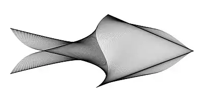 Naderi Yeganeh has introduced two methods to draw real-life objects with mathematical formulas.[4] By the first method, he creates tens of thousands of computer-generated mathematical figures to find a few interesting shapes accidentally. Then he changes the equations a little bit in order to increase the resemblance of the accidentally found shapes to real life objects.[40][41][42] For example, by using this method, he found some shapes that resemble birds, fishes and sailing boats.[43][44][45][46] In the second method, he draws a real life object with a step-by-step process. In each step, he tries to find out which mathematical formulas will produce the drawing.[47][4] For example, by using this method, he drew birds in flight, butterflies, human faces and plants using trigonometric functions.[48][49][50][47][51][52] Naderi Yeganeh says: "In order to create such shapes, it is very useful to know the properties of the trigonometric functions".[53][48] In 2018, in an interview with the Sharif University of Technology Public Relations Naderi Yeganeh said: I use mathematical concepts in a work of art in a way that it could be thoroughly explained in a paragraph. That makes the understanding of an artwork's scientific underpinning easier.[54]