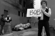 The music video references the recording of Dylan's song, "Subterranean Homesick Blues" in the 1967 D. A. Pennebaker documentary Dont Look Back.[3] The video for "Bob" is similarly shot in black-and-white, and in the same back-alley setting, with Yankovic dressing as Dylan and dropping cue cards that have the song's lyrics on them, as Dylan did in the film.[3][4][11] The video features cameo appearances by drummer Jon "Bermuda" Schwartz and frequent Yankovic video director Jay Levey, standing in the same positions as Allen Ginsberg and Bob Neuwirth in the Dylan video.