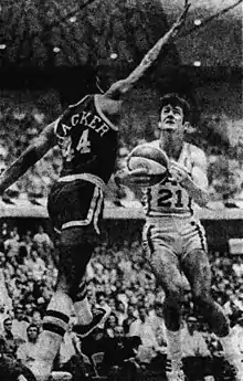 ![]() Tom Thacker (left) attempts to block a shot by Bob Warren (right), circa 1970. | |