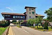 In 1995, to offer a counterpart to the “German Wine Gate” (Deutsches Weintor) at the other end of the German Wine Route in Schweigen, which since 1936 had been marking the route's far (from Bockenheim's point of view) end, the Haus der Deutschen Weinstraße (“House of the German Wine Route”) was built between Großbockenheim and Kleinbockenheim. Built in the style of a Roman castrum, the House spans the road like a bridge and affords room not only for a 120-place restaurant with a lakeside terrace, but also for various event venues. In the Turmzimmer (“Tower Room”) with its view of the surrounding vineyards, the Upper Rhine Plain and even the Odenwald, those wishing to be wed may have a Weinstraßenhochzeit (“Wine Route Wedding”).