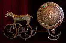 Other items deposited in the wetlands during the Bronze Age were far rarer and wealthier goods, and these have been more readily associated with religious practice among archaeologists; such items include the Trundholm sun chariot, the horned Veksø helmets, and the lur horns.[15] At Mariesminde on Funen, 11 golden bowls with horse-head handles were found inside a bronze amphora that had been imported into Scandinavia from Central Europe.[18] At Midskov in Funen seven gold bowls were found in a small waterhole under 20 metres in diameter.[18] Many of these items would have been represented high material value and a high degree of craftsmanship.[15] They would have been obtained from further south in Europe, and depositing them in the wetlands would have therefore taken them out of circulation.[15] Kaul suggested that such luxury items may have been used for a certain number of years, for specific ceremonial occasions, before they were removed from circulation by being deposited in the wetlands.[15] Various explanations have been put forward to explain this rise; perhaps it represents the increasing importance of a female deity in the religious beliefs of the area, or it could indicate a growth in women's societal status in this period. Conversely, these feminine items could have represented male status in Bronze Age Scandinavia.[19]
