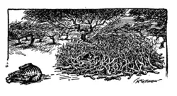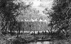 Apart from the neatly built stockades shown in illustrations of bomas, the term, in practice, more often resembled the structure shown in the illustration accompanying this article. In that form, they often were referred to by the likes of J. A. Hunter[2] and Henry Morton Stanley.[3][4]