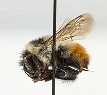 Due to the lack of discernible head and body characters placement of the fossil was based on morphometric analysis of the wings. A series of three morphometric analysis groups were used to narrow down the placement of the fossil within the superfamily Apoidea. A broad data set with 979 female specimens and covering 18 subfamilies was used first to determine the family placement of the fossil, narrowing down to Apidae. The second data set included females from five different Apidae tribes Ancylaini, Bombini, Emphorini, Euglossini, Tarsaliini, and Tetrapediini that showed the fossil to be a member of the tribe Bombini. A final modified dataset of 841 specimens was used that included 100% of the Bombus subgenus diversity and at 210 species, over 80% of the living species. Based on the forewing morphology the fossil was grouped in Bombus subgenus Cullumanobombus, but the dataset did not give clear indication if the fossil was a stem-group or a crown group species.[8] The vein patterning, and cell shapes and sizes are most similar to the extant species Bombus (Cullumanobombus) rufocinctus, the "red-belted bumblebee", which is native to much of the Nearctic.[9] The two species are distinguished from each other based on the pterostigma and marginal cell shapes and the curvature of the 2rs-m vein.[9] If the fossil is considered a stem-group species, then the wing venation may be symplesiomorphic with that of B. rufocinctus which is basal within B. subgenus Cullumanobombus.[7]