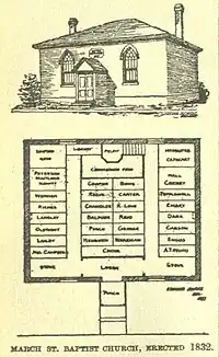 In 1832, the first chapel was built (later called the Newsboys Home) on what was then known as March, (later, Stanley, but now Lombard street). At that time the street had been laid out, but there were scarcely any buildings on it, and it was thought it might become one of the best streets in the city. The chapel itself was far from being attractive, besides being very small, its seating capacity being about one hundred and sixty. Unfortunately the street became known as one of the rougher parts of town with local residents making church services very difficult even requiring police officers to patrol the streets to keep the peace during evening worship services. Church life was difficult with leadership difficulties included. The congregation on March Street was officially organized on October 31, 1840, the previous congregations having become defunct. William McMaster a prominent Toronto businessman and an immigrant from County Tyrone, Ireland during the month of May 1848, united with the church by experience.[3]