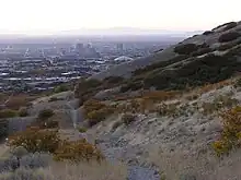 The Bonneville Shoreline Trail is a mixed use (biking/hiking) recreation trail in Utah that roughly follows the shoreline of the ancient Lake Bonneville, a prehistoric pluvial lake which existed in northern Utah before naturally draining about 14,000 years ago.[1][2] Some sections of the trail are complete while other parts are still being developed. The Bonneville Shoreline Trail hopes to one day stretch from the Idaho border (north of Logan, Utah) and run southward all the way to Nephi, Utah.