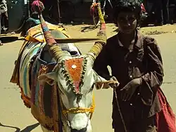 A Boom Boom Ox (Tamil: பூம் பூம் மாடு) is a decorated ox used in Tamil Nadu, India for fortune-telling by Boom Boom Mattukaran tribe.For example Gowtham mattukumaran These oxen are decorated with jewellery, bells and bright cloth and are led by fortune tellers to individual houses or places where people gather. The patron usually stands in front of the ox and the fortune teller. The fortune teller asks the ox questions in a sing-song voice about the future of the patron. The Ox is trained to nod yes or no for the questions and from its head nods, the fortune teller tells the fortune of the patron. The term "Boom Boom Ox" is also used an insult in Tamil to denote a yes man or a weak willed person.[1]