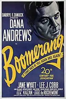 Boomerang! is a 1947 American crime semidocumentary film based on the true story of a vagrant accused of murder. It stars Dana Andrews, Lee J. Cobb, Karl Malden, Arthur Kennedy and Jane Wyatt, with voiceovers by Reed Hadley.