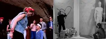 According to Douglas Kellner, author of Media Culture: Cultural Studies, Identity, and Politics Between the Modern and the Postmodern, by having a Hispanic man play her love interest in the video, Madonna was breaking the "taboo of interracial relationships".[79] The author also saw this as a marketing strategy: the singer was inviting whites, Hispanics and other people of color to "fantasize that, they too can have or be [her]", thus successfully appealing to different audiences.[79] Kellner also held that the multiple and contrasting outfits Madonna wears throughout the visual suggested that, "one's identity is a construct that can [be] modified or change[d] at will".[79] He also noted how Madonna was starting to use fashion, sexuality and "the construction of image to present herself as both an alluring sex object and a transgressor of established borderlines", citing a scene in which she sprays graffiti all over classical sculptures as an example.[79] In The Cultural Politics of U.S. Immigration, Leah Perry specified that the singer had painted over the statues' genitals, thereby creating a "female sexuality that was independent of patriarchal control [...] that defied rather than rejected the male gaze".[76]