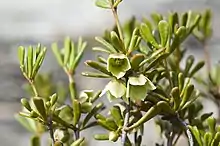 Boronia octandra is a shrub that grows to a height of 30 cm (12 in) with its young stems covered with short, soft hairs. The leaves are trifoliate and each leaflet is more or less cylindrical to club-shaped and about 5 mm (0.20 in) long. The flowers are borne singly in leaf axils and are greenish cream to yellowish brown on a top-shaped pedicel about 2 mm (0.079 in) long. The four sepals are egg-shaped, about 3 mm (0.1 in) long and the four petals are broadly elliptic and about 8 mm (0.3 in) long. The eight stamens are all fertile and alternate in length with those adjacent to the petals shorter than those adjacent to the sepals. Flowering occurs from June to October.[2][3]