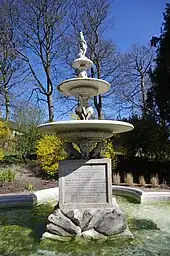 The bandstand, designed by the Borough Surveyor G. J. Hunt, celebrating Queen Victoria's Diamond Jubilee, was opened in 1898. It, and its 12 surrounding benches, are listed at Grade II.[2] The fountain, donated in memory of G. J. Gregory, five times Mayor of Dorchester, was opened in that year. The Tirah Memorial, a stone obelisk erected in 1899, is a memorial to men of the 1st Battalion of the Dorset Regiment who had died in the Tirah Campaign of 1897–98 in India. A cast-iron clock tower (now Grade II-listed[3]) was donated in 1905 by Charles Hansford.[1][4]