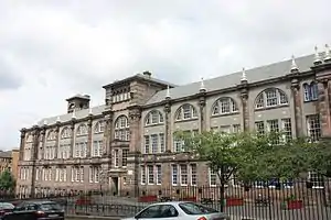 The school moved to a site at 26 Viewforth, also designed by Carfrae, from 1913 to 2018.[5] Built as a ‘higher grade’ school, the building was designed to accommodate over 1200 pupils in 40 classrooms. It was a large '8 block' centred around two quads (with a gymnasium at the lower ground floor), the perimeter corridor and surrounding classrooms had large tripartite windows and corridor windows facing the 'quad'. Additional wings, dining halls, glazed roofs and mezzanine floors were added later as the school struggled for space[6] The school also used nearby St Oswalds Hall as an annex.[7]