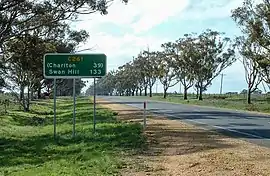 The Borung Highway is a 138 kilometre rural highway in western Victoria running in a west–east direction from Dimboola in the west to Charlton in the east. The highway serves little more than connectivity between local communities, and is busiest between the towns of Donald and Charlton (with exception to the 15 km section that it shares with the Sunraysia Highway between Donald and Litchfield). The more notable features along the highway exist in the pastoral scenery, and the surprising appearance of lakes amongst the rolling hills. Buloke trees (from which the Shire of Buloke gets its name), are a regular feature along the eastern segment of the road.