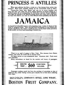 "Andrew Preston chose the West Indies as the site for his entry into the banana exporting business. The Boston Fruit Co. also moved into the production end of the business when it bought plantations in Jamaica. The fact that ... Preston owned [the] sources of supply differentiated [him] from others in the business. Until then, it was unheard of for companies to deal at the supply end of the banana trade."[8] "Along the northeastern and eastern coast of the island of Jamaica, extensive tracts of land are cultivated by the natives, on which are raised the yellow Jamaica banana. The Boston Fruit Company own about 10,000 acres of this land, and under the supervision of Capt. Baker, who resides there, bananas are raised for the Company's use. Since the cultivation of Jamaica fruit has been taken into the hands of Boston parties, the quality has improved steadily, and this year handlers of this fruit claim that the quality is the best that ever came from there, and they attribute this to the careful handling of the bananas all along the line, as well as their careful cultivation."[6]