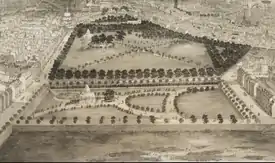 Boston's Back Bay, including the land the garden sits on, was mudflats until filling began in the early 1800s. The land of the Public Garden was the earliest filled, as the area that is now Charles Street had been used as a ropewalk since 1796.[4] The town of Boston granted ropemakers use of the land on July 30, 1794,[5] after a fire had destroyed the ropewalks in a more populated area of the city. As a condition of its use, the ropewalk's proprietors were required to build a seawall and fill in the land which is now Charles Street and the land immediately bordering it (now a part of the Public Garden).