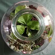 A bottle garden is a type of closed terrarium in which plants are grown. They usually consist of a plastic or glass bottle with a narrow neck and a small opening. Plants are grown inside the bottle with little or no exposure to the outside environment and can be contained indefinitely inside the bottle if properly illuminated.[1] The oldest bottle garden in existence is alleged to have been planted in 1960, and to have remained sealed from 1972 until at least 2013.[2]