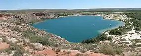 Lazy Lagoon is the largest of the lakes, with a surface area of approximately 26.1 acres (10.6 ha). Although it is a single lake, it is made up of three separate sinkholes. The surface of the Lazy Lagoon is nearly level with the surrounding salt flats, which makes it look very shallow. Despite the name, the deepest of its three sinkholes is 90 feet (27 m) deep.[3][4]