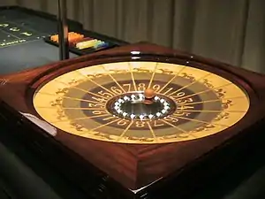 The wheel is divided into 18 pockets which are numbered from 1 to 9, each number occurring twice. The numbers 1, 3, 6 and 8 are black, while the numbers 2, 4, 7 and 9 are red, and 5 is yellow.