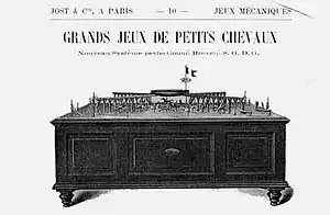 Petits Chevaux was the predecessor of Boule. The pockets of many Boule wheels are decorated with pictures of horses in commemoration of Petits Chevaux. Around 1900 Petits Chevaux was a very popular casino game. A surviving gaming table by the firm of J. A. Jost (Paris c. 1905) is displayed in the Swiss Museum of Games in La Tour-de-Peilz. Until 2003, a similar game, the horse roulette game of Klondyke, was played in Baden-Baden's casino at the time of the Iffezheim Races. The gaming apparatus is housed today in Baden-Baden's Municipal Museum.