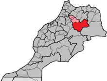 Location of the province Boulemane within the region Fès-Boulemane, Morocco, prior to the merger in 2015. At this time Morocco had 16 regions, subdivided into 62 provinces and 13 prefectures.