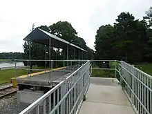 Discussions on the station were effectively nonexistent for the following three years, until it was announced that a smaller station would be built for service during the 2019 season. While initial plans for a fully constructed station were not realized, a prefabricated section of high-level platform was installed in May 2019 at the Bourne Bridge site,[19] which the CapeFlyer began serving shortly after completion. Parking areas are not provided, as the station is primarily intended for train passengers to be picked up or dropped off.[2]