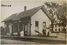 Monument station was built by the Cape Cod Branch Railroad when the railroad line was extended from Wareham to Sandwich in 1848.[4] It was located at what is now Old Bridge Road on the north side of the Monument River, approximately where the north canal service road / bike path is now located.[5] The station was renamed Bourne by the Old Colony Railroad around 1884.[6][7]