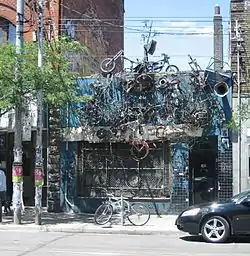 The Bovine's facade was built by a small group of local artists including Dave Grieveson and Great Bob Scott (also the drummer for The Look People).[4] They worked under the creator of the Bovine, Happy Dog (real name - Wesley Thuro). The exterior and interior were an art installation made solely from discarded items.[5]