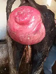 Bovine prolapsed vagina can occur when the cow is near calving, in the late phases of cow's pregnancy (usually last trimester).[1] Sometimes cow's cervix prolapses along its vagina,[5] and such condition is known as the bovine cervico-vaginal prolapse.[3][6] It can happen that cow's urinary bladder gets contained within the prolapsed vagina.[7]
