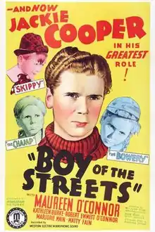 Boy of the Streets is a 1937 American drama film directed by William Nigh and written by Gilson Brown and Scott Darling. The film stars Jackie Cooper, Maureen O'Connor, Kathleen Burke, Robert Emmett O'Connor, Marjorie Main and Matty Fain. The film was released on December 8, 1937, by Monogram Pictures.[1][2][3]