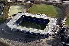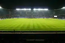 The connected upper stands meant that the corners of the stadium became partly enclosed, and toilet stalls as well as food and drink outlets were placed in the spaces between the lower and upper stands.[42] The new upper stands included 13,600 new seats, increasing the total capacity to 31,500 spectators.[38] For international matches, capacity was limited to 26,500 spectators as they demand all-seated crowds.[38] The entire redevelopment progressed while the club still played its home games at the stadium, and the original changing rooms under the main grandstand, originating from 1978, were retained.[42]