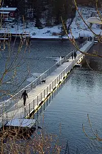 In 1953, the nursing home on the island was acquired by Jens H. Koefoed, who was impressed by the cable ferry between Ormøya and Padda in Oslo. In 1955 he set up the first cable ferry across the Vendel sound. He also installed a pontoon bridge that floated on railroad ties, yet without hand rails. This worked well when the sound was frozen, but when the ice thawed and broke, pedestrians usually had to run across the bridge to stay dry. The ties were presently replaced by empty oil barrels.[2] By the 1960s, several forces converged to improve access. Both the municipality and private owners had taken steps to acquire harbor sites on the island, auto ownership and traffic was increasing, and there was increased interest in commuting between Oslo and Brønnøya. The municipality expropriated the lot needed to build a walkway from the bridge landing to the road on Nesøya, and the harbormaster approved the use of the cable ferry.