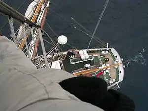 The braces are fixed to the outer ends of the yards, and are led to the deck as far aft as possible, to allow the crew to haul on them. The lower yards' braces can usually run directly to the deck, but to do so with those higher up would mean that most of the force was pulling downwards rather than backwards. Instead, the braces for the upper yards run to another mast and thence to the deck. On the aftermost mast, this may mean they have to be led forwards instead of backwards. Braces from the aftermost mast that run to the very stern of the ship often pass through blocks attached to short outriggers projecting from the side of the ship in order to improve their lead. These projections are called bumkins and can be seen in the picture.
