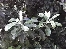 This species is a shrub or tree up to about 10 meters tall,[1] but known to reach 27[2] to 29 meters at times.[4] The branches are brown or purple-tinged, and hairy when new. The leaves are oval or oblong and usually up to 12 centimeters long. They are smooth-edged to toothed to spine-toothed. They are mostly hairless and a shiny dull green on top and grayish hairy underneath. Flowers are borne in large panicles at the ends of branches and shorter panicles in the leaf axils.[1] The species is dioecious, with flower heads that look like "plump shaving brushes".[4] Male plants have heads with short phyllaries and a single layer of pappus hairs. Female heads have longer phyllaries and multiple layers of pappus hairs.[1]