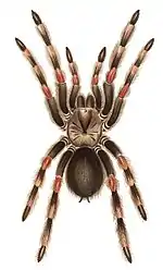 Brachypelma smithi is a species of spider in the family Theraphosidae (tarantulas) native to Mexico.[3] It has been confused with Brachypelma hamorii; both have been called Mexican redknee tarantulas.[4] Mexican redknee tarantulas are a popular choice as pets among tarantula keepers. Many earlier sources referring to B. smithi either relate to B. hamorii or do not distinguish between the two species. B. smithi is a terrestrial tarantula native to Pacific coast of the Mexican state of Guerrero.[4]