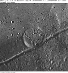 Brackett is a small lunar impact crater that lies near the southeast edge of Mare Serenitatis. The crater is named after American physicist Frederick Sumner Brackett.[1] The crater has been covered by lava flow, leaving only a ring-shaped trace in the surrounding lunar mare. This crater is best observed under oblique illumination, as it is otherwise difficult to find. The southern rim is almost contacting a rille system named the Rimae Plinius.
