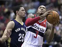 On November 4, 2015, Beal scored a game-high 25 points and made a three-pointer with 0.3 seconds remaining to lift the Wizards to a 102–99 win over the San Antonio Spurs.[19] Beal had an injury-plagued season in 2015–16, as he missed three games in mid-November with a shoulder injury,[20] and 16 games between December 11 and January 11 with a lower right leg injury.[21] He had another stint on the sidelines in early March, missing three games with a sprained pelvis.[22] He played in a career-low 55 games in 2015–16, and made a career-low 35 starts, but did record a career-high 17.4 points per game.[23]