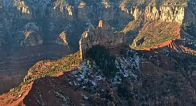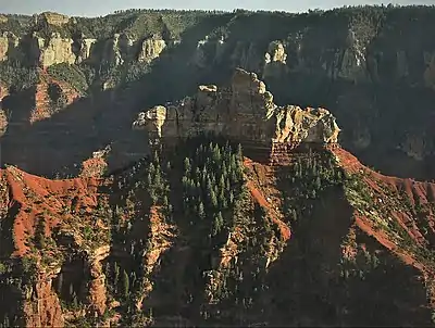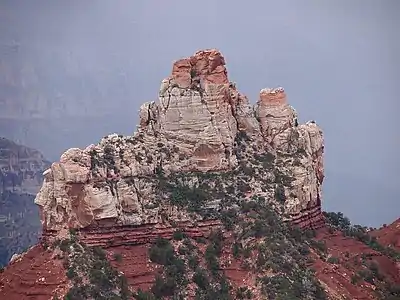 Brady Peak is an 8,121-foot (2,475 m)-elevation summit located in the Grand Canyon, in Coconino County of northern Arizona, United States.[3] It is situated one mile (1.6 km) northeast of the Vista Encantada viewpoint on the canyon's North Rim, where it towers 4,800 feet (1,500 m) above the bottom of Nankoweap Canyon. Its nearest higher neighbor is Mount Hayden, two miles (3.2 km) to the north, Kibbey Butte is one mile to northwest, and Alsap Butte lies one mile to the northeast.[1] Brady Peak is named after Peter Rainsford Brady (1825–1902), a pioneer and politician of the Arizona Territory.[3] This geographical feature's name was officially adopted in 1932 by the U.S. Board on Geographic Names.[3] According to the Köppen climate classification system, Brady Peak is located in a cold semi-arid climate zone.[4]