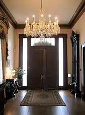 The house is two-stories and built on a T-shaped plan. The architecture is in the Greek Revival style with tall, spindly columns that are derivative of the Doric order around a three-sided veranda. The bracketed cornice indicates some Italianate influence, a fusion of stylistic elements that some have dubbed a "bracketed Greek Revival".[5] It contains fourteen rooms, with seven of those being bedrooms. The ground floor features 15-foot (4.6 m) ceilings.[6]