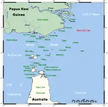 ![]() A map of the Torres Strait Islands in the waters of Torres Strait; Bramble Cay labeled in red in upper right | |