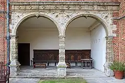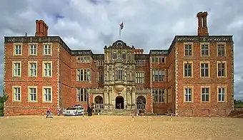 The north façade has three bays separated by windows and features a loggia, typical of early 17th-century houses, with a central arched entrance to accommodate coaches.[43] The central bay is crowned by an ornamental pierced parapet below a niched Dutch gable, which shelters a small statue of Lord Zouche[43][46] or James I.[47] There are small obelisks at either side of the gable.[28] Thorpe originally intended the main entrance of the house to be on this side, building on the gatehouse of the earlier Foxley house.[48]