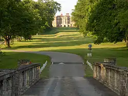 The main avenue approaches from the southwest, through an arched gateway formed by two Grade II listed early 19th-century lodges,[89] before crossing the Broad Water formed by the River Hart by a Grade I listed early 19th-century bridge with two arches.[90] There are separate listings for other structures near the house, including the Grade I listed early 17th-century triple-arched gateway on the route to Reading to the northeast of the house,[91] Grade I listed early 17th-century boundary walls and turrets to the south and west,[92] Grade II listed boundary walls and gate-piers to the west, including the kitchen garden,[93] Grade I listed garden walls and gateways to the north and east,[94] and the Grade II listed late 18th-century stable block to the north.[95]