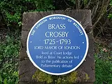 Crosby died in 1793 at his house in Chatham Place, Blackfriars Bridge, and was buried in Chelsfield Church, near Orpington, Kent, where a monument was erected to his memory. The London Borough of Bromley has now erected a blue plaque to Crosby outside his former home, Court Lodge, in Church Road, Chelsfield. He had married three times,[8][9][3] each time to a well-to-do widow, the third of whom had brought him Chelsford manor, but left no surviving children.