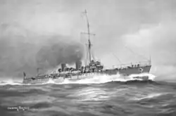 Bahia was part of a large 1904 naval building program by Brazil.[6][7] Also planned as part of this were the two Minas Geraes-class dreadnoughts, ten Pará-class destroyers, three submarines and a submarine tender.[7][8] With a design that borrowed heavily from the British Adventure-class scout cruisers,[1] Bahia's keel was laid on 19 August 1907 in Armstrong Whitworth's Elswick, Newcastle upon Tyne yard.[1][2] Construction took about a year and a half, and she was launched on 20 January 1909 with Madame Altino Correia being the sponsor on behalf of Madame Dr. Araugo Pinho.[9][2][6][upper-alpha 1] The process of fitting out pushed its completion date to 2 March 1910,[2] after which it sailed to Brazil and arrived in Recife on 6 May.[3] The new cruiser—the third ship of the Brazilian Navy to honor the state of Bahia[3][6]—was commissioned into the navy shortly thereafter on 21 May 1910.[3] As a class, Bahia and Rio Grande do Sul were the fastest cruisers in the world when they were commissioned,[1] and the first in the Brazilian Navy to utilize steam turbines for propulsion.[3]